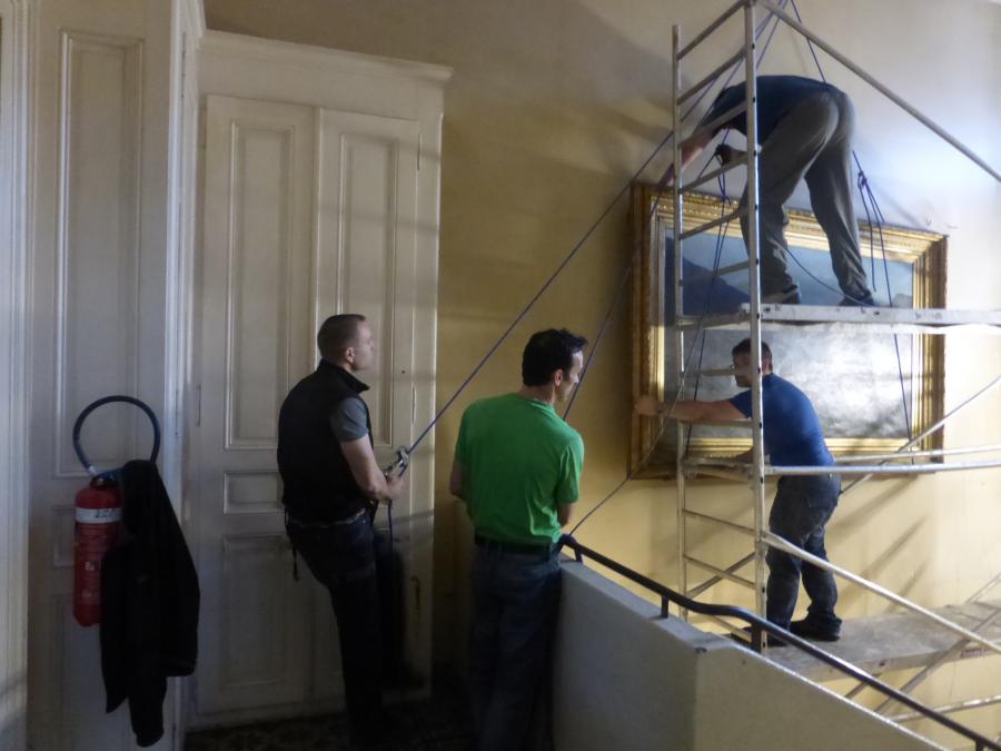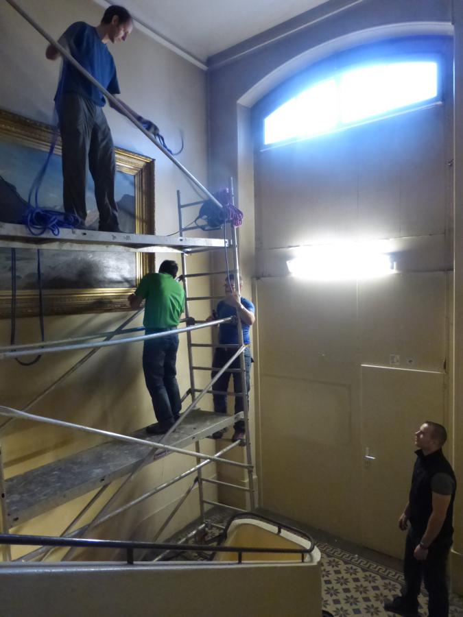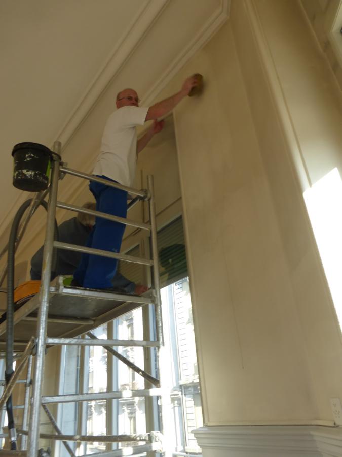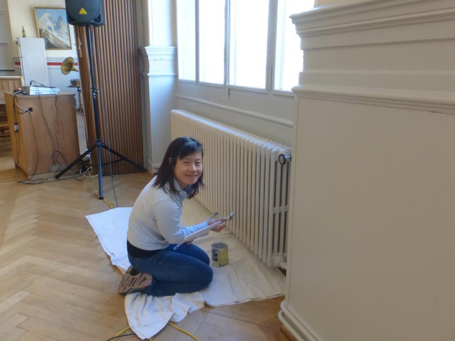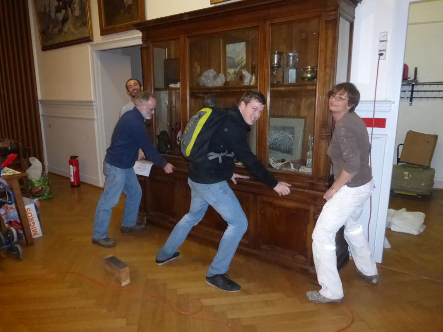 • Entrée, cage d’escaliers et grande salle rénovés et repeints aux couleurs gris (rochers) et blanc (neige), avec des bandes et filets rouge (rappelant l’écusson du CAS et le drapeau suisse)